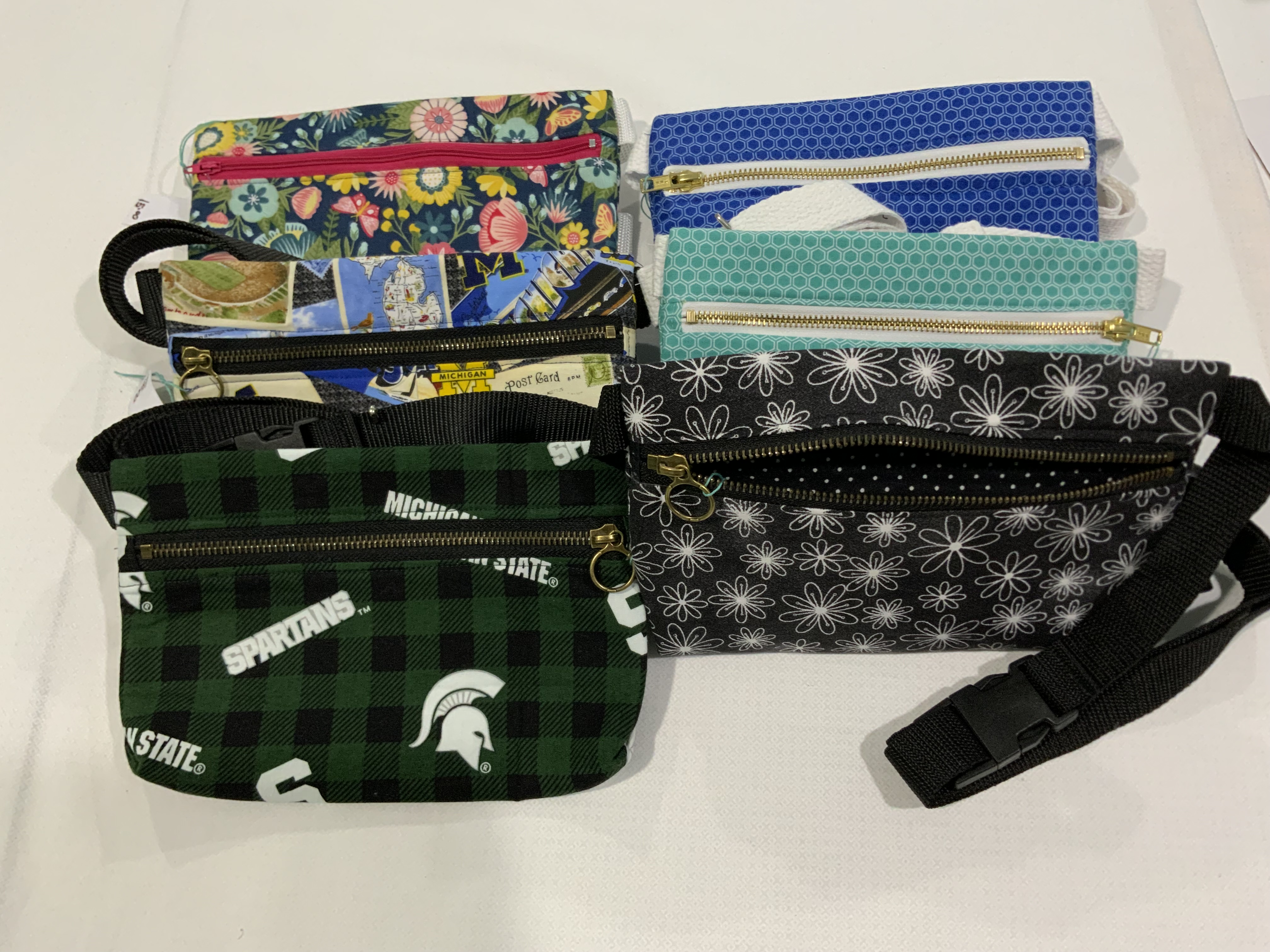 Fanny pack or cross body purse 6”x8” with a strap adjusts as small as 30” to approximately 48”. Fabric is pre-washed cotton.