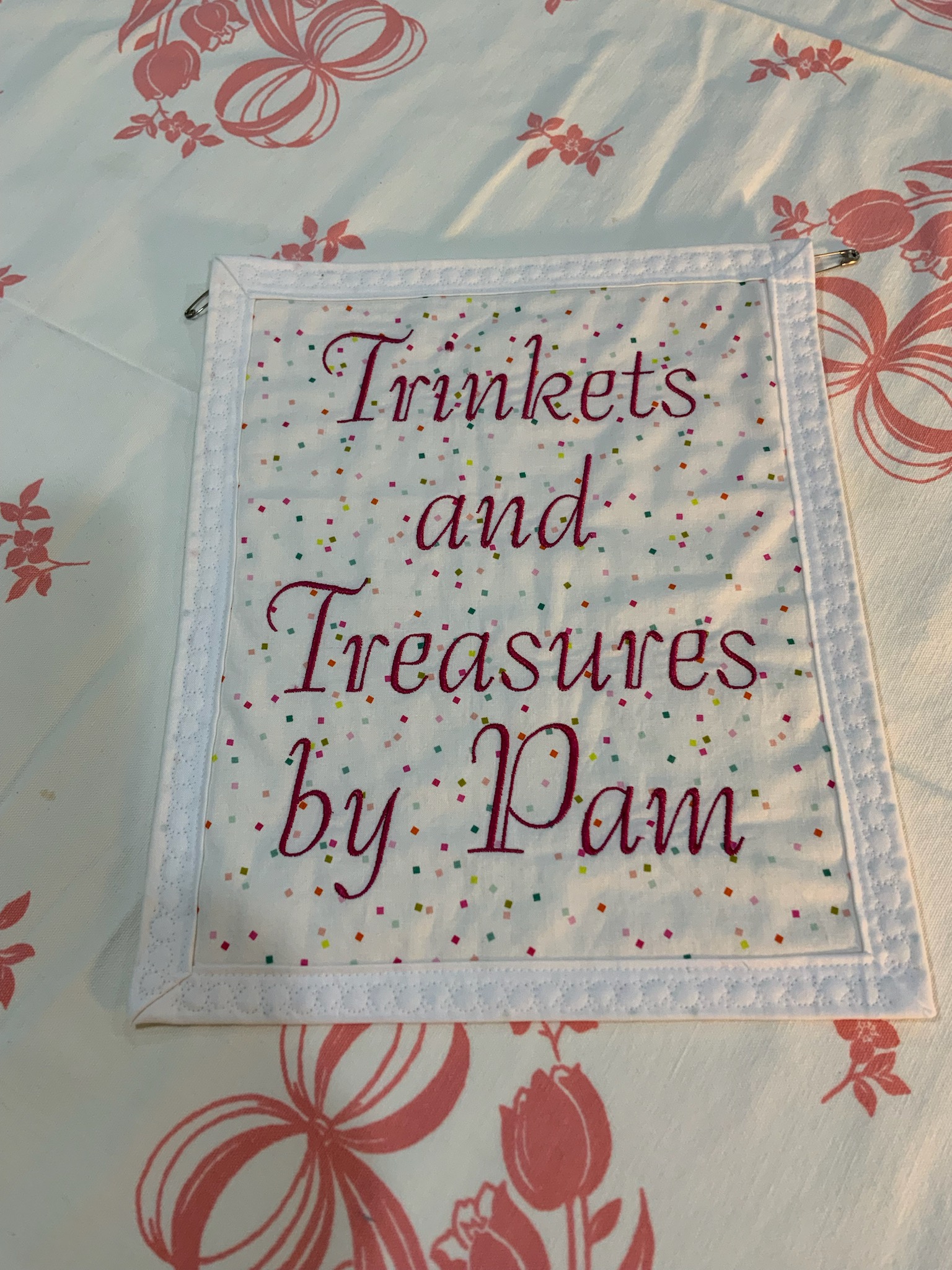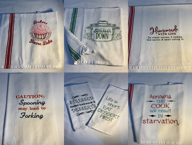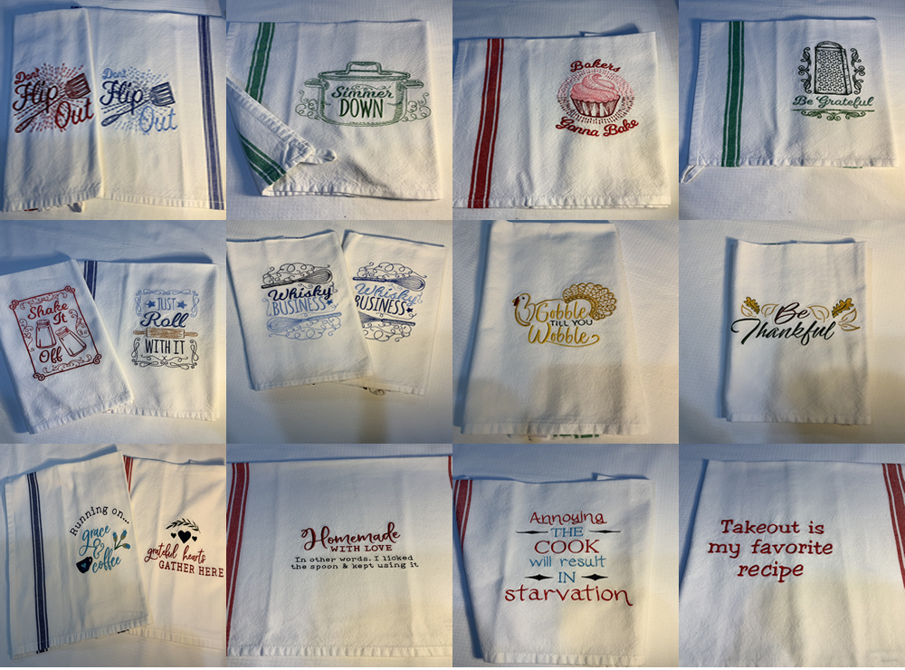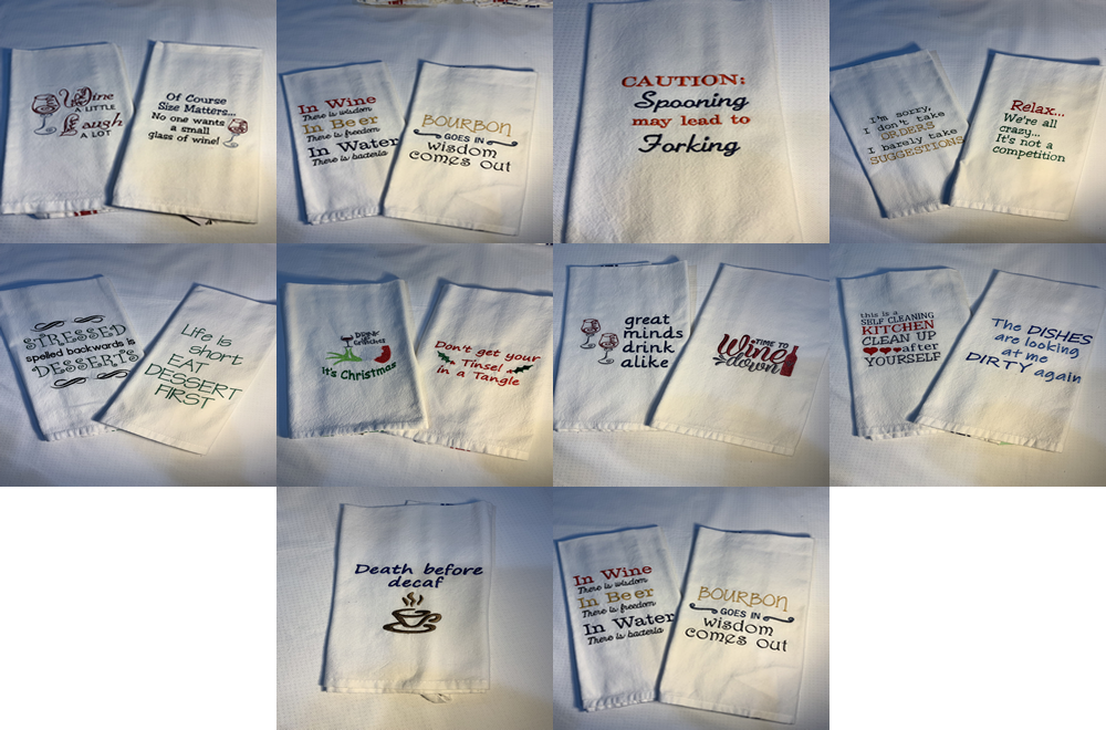 Embroidered Tea Towels. 100% cotton with either red, blue or green stripes down the sides and a loop at the top to hang it by. The towel size is approximately 15”x 25” they may vary do to the pre-washing. Use the saying on the towel for inquiries.